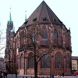 Sakralbau in Nürnberg. An Stelle romanischer Vorgängerbauten entstand sie in drei Bauphasen.