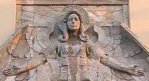 Die Frauengestalt über dem Eingangsportal ist ein Schutzengel, der mit ausgebreiteten Armen